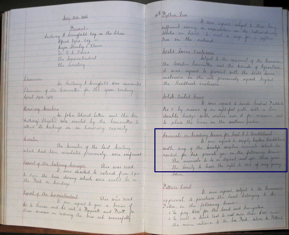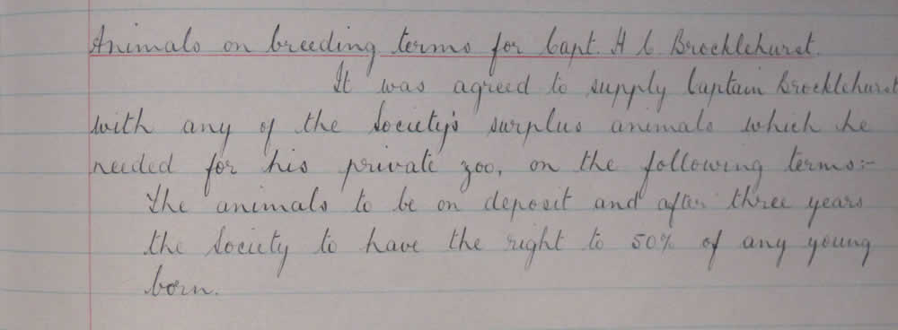 Courtney had started his zoo in 1936 with animals from Whipsnade. The reporter suggests that it was a sort of outpost of that zoo, in case their stock should be devastated by disease or disaster. This story has been repeated many times, both in the press and on the internet. However when I looked in the archives of the Zoological Society it turned out that Courtney had simply been loaned some of their surplus stock, on the understanding they had a right to half of any offspring (see attached images, which are copies of the minutes of Whipsnade Zoo Management Committee from 13 May 1936 image 1, image 2). It seems it was not uncommon for surplus animals to be passed onto private zoos at that time. There are other examples in the Minutes of the Zoo.