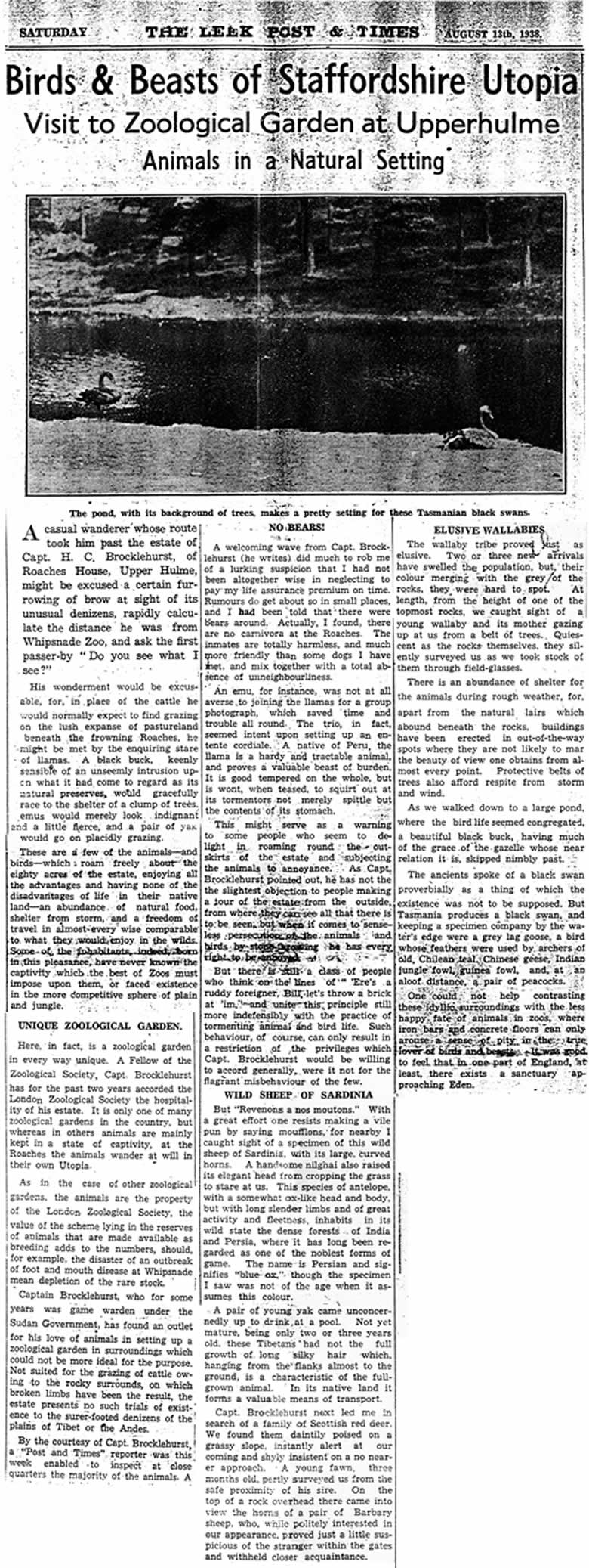 There was an article written in the Leek Post & Times newspaper on August 13th 1938 about the private zoo at Roaches Hall, Upper Hulme kept by Courtney Brocklehurst. Click this link to see an image of the article. It is quite a large file so may take a while to download. Click